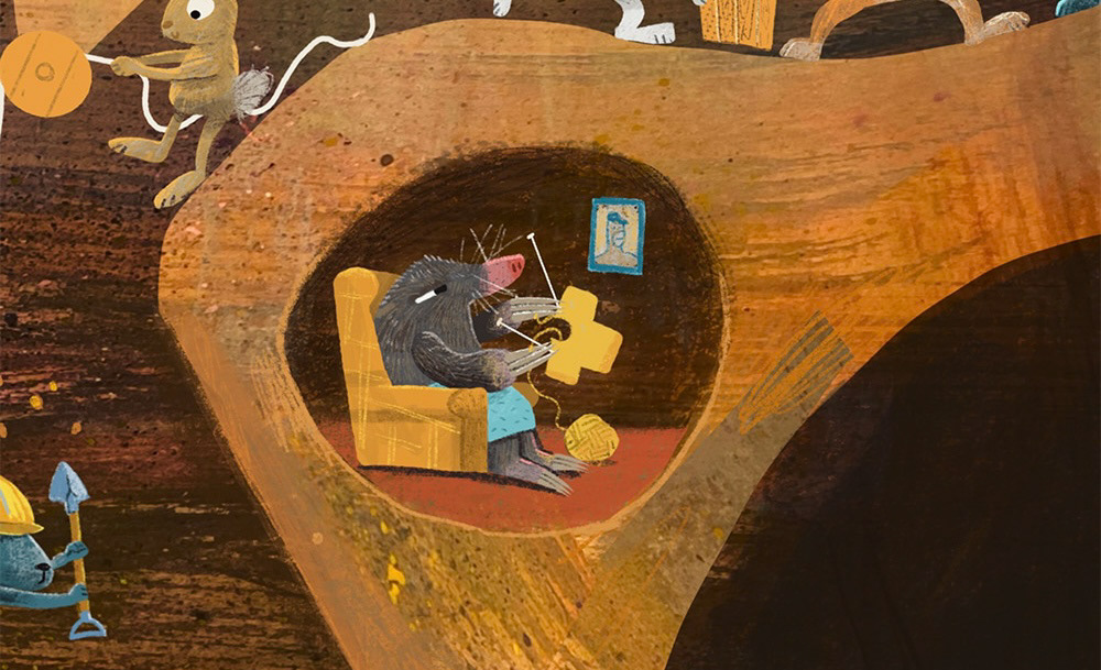 Illustration of a Mole knitting while rabbits work away digging all around them. This detail is part of a picturebook spread illustrated by Adam Ming.